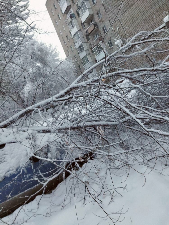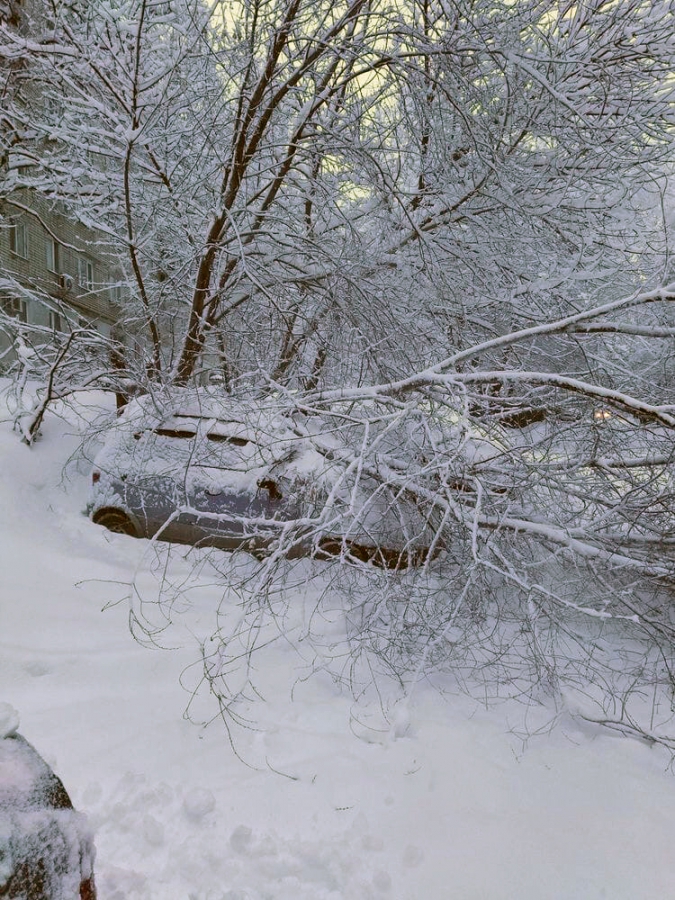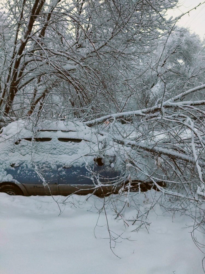 В Саратове из-за сильного снегопада деревья падают на автомобили