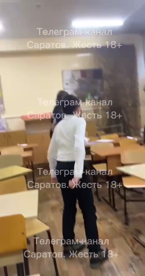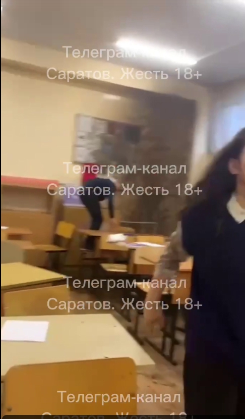 В опубликованных роликах видно, что в классе вдоль одной из стен водопадом течет вода. Дети разбегаются подальше от потопа, комната заляпана множеством мутных капель.