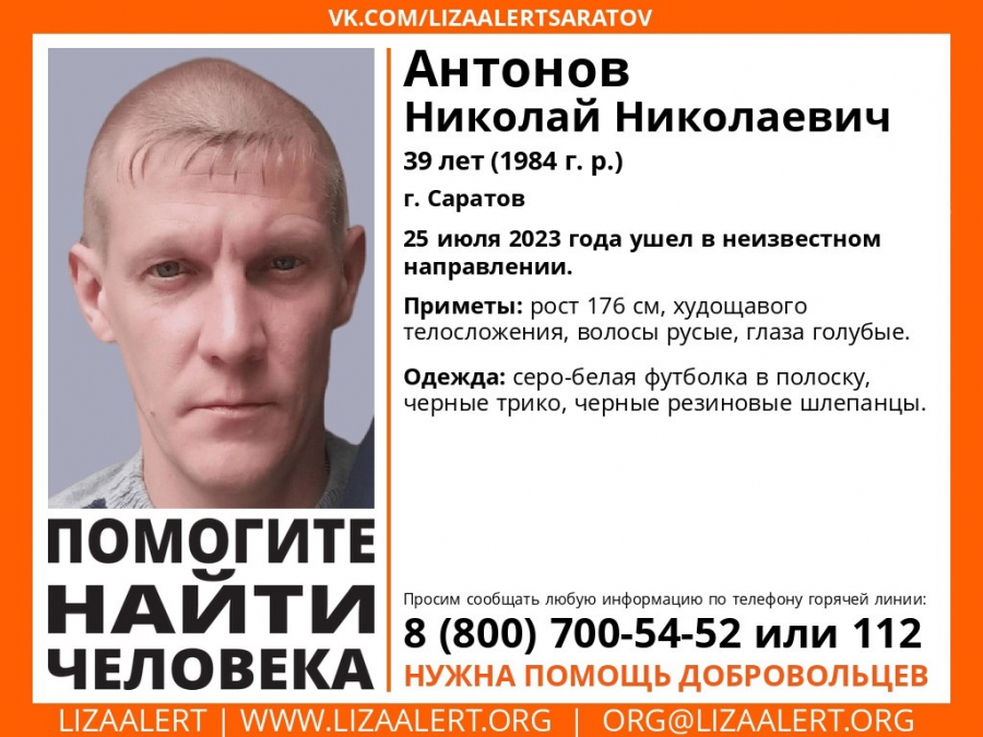 В Саратове ищут пропавшего без вести 39-летнего Николая Антонова. Об этом сообщили сегодня, 24 августа, волонтеры регионального отделения поискового отряда «Лиза Алерт».