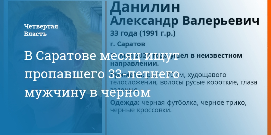 В Саратове пропал без вести 33-летний Александр Данилин. Об этом сообщили в соцсетях поискового отряда «ЛизаАлерт».