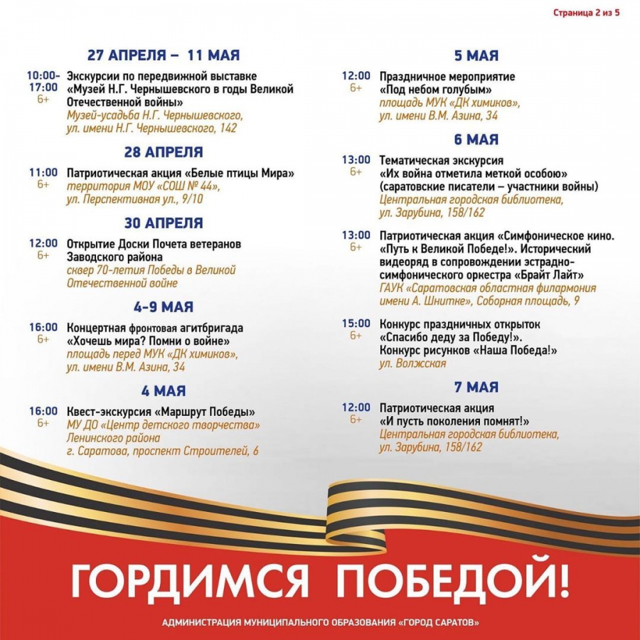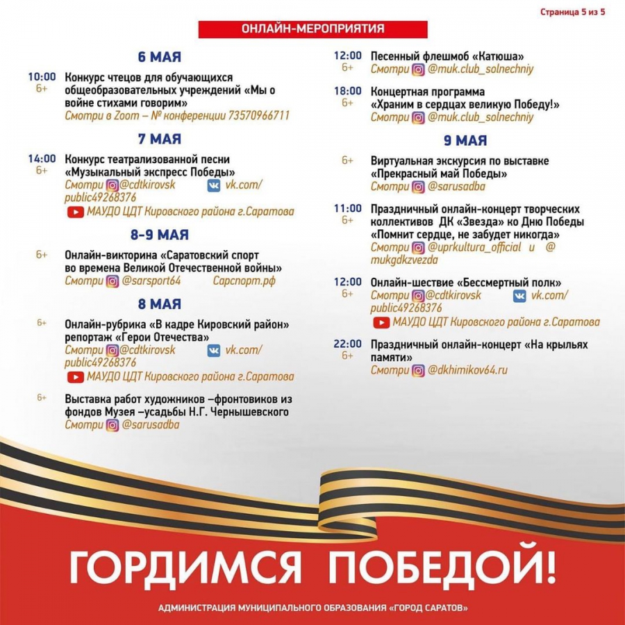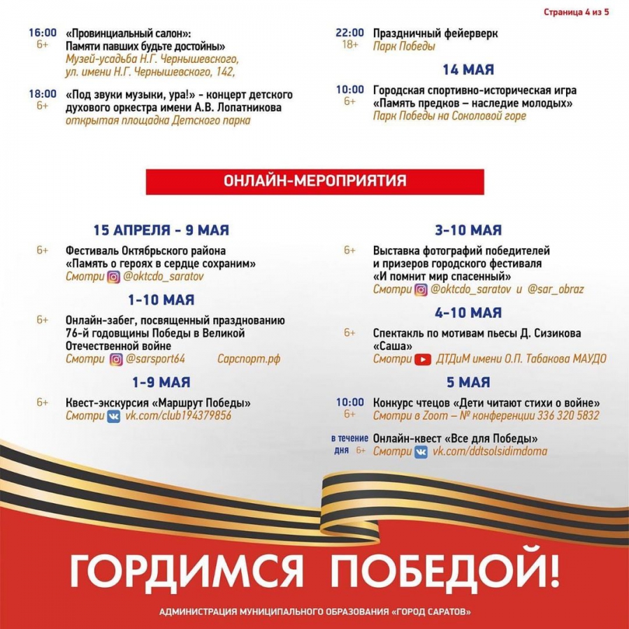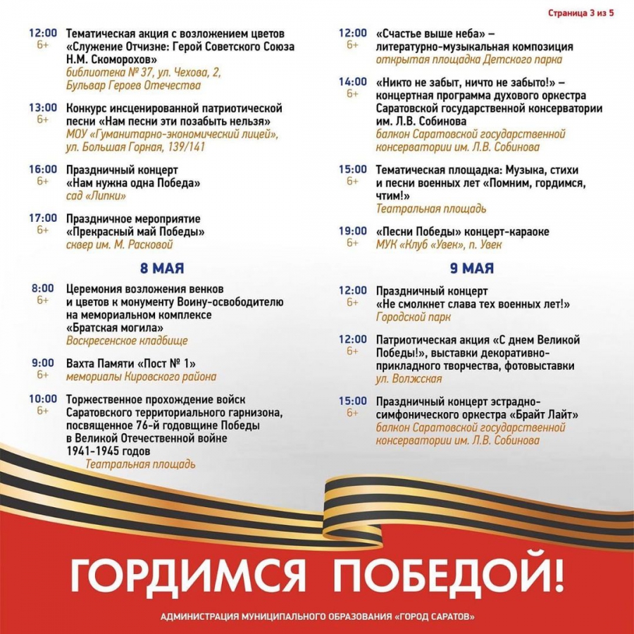Кроме того, глава города Михаил Исаев опубликовал в «Инстаграме*» план мероприятий в рамках празднования. В частности, 8 мая пройдет церемония возложения венков и цветов к монументу «Воину-освободителю на мемориальном комплексе Братская могила» (Воскресенское кладбище). Еще в 10.00 на Театральной площади состоится торжественное прохождение войск, а с 15.00 там начнется мероприятие с музыкой, стихами и песнями военных лет. Ряд мероприятий ожидается в онлайн-формате, например, 9 мая с 12.00 – акция «Бессмертный полк».