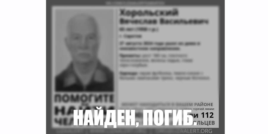 В Саратове прекращены поиски 65-летнего Вячеслава Хорольского, который пропал неделю назад. Об этом сообщили в соцсетях волонтеры поисково-спасательного отряда «Лиза Алерт».