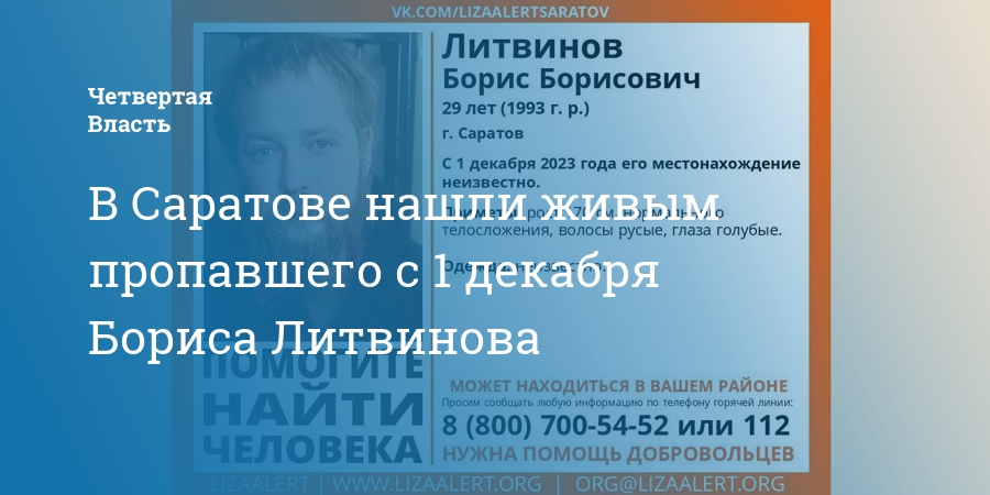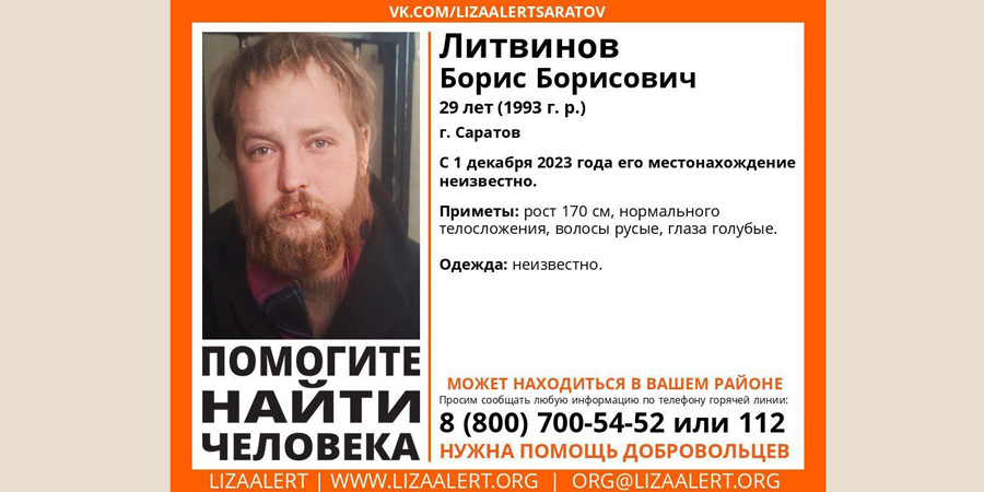 В Саратове нашли без вести пропавшего 29-летнего Бориса Литвинова. Об этом сообщили сегодня, 13 февраля, волонтеры поискового отряда «Лиза Алерт».