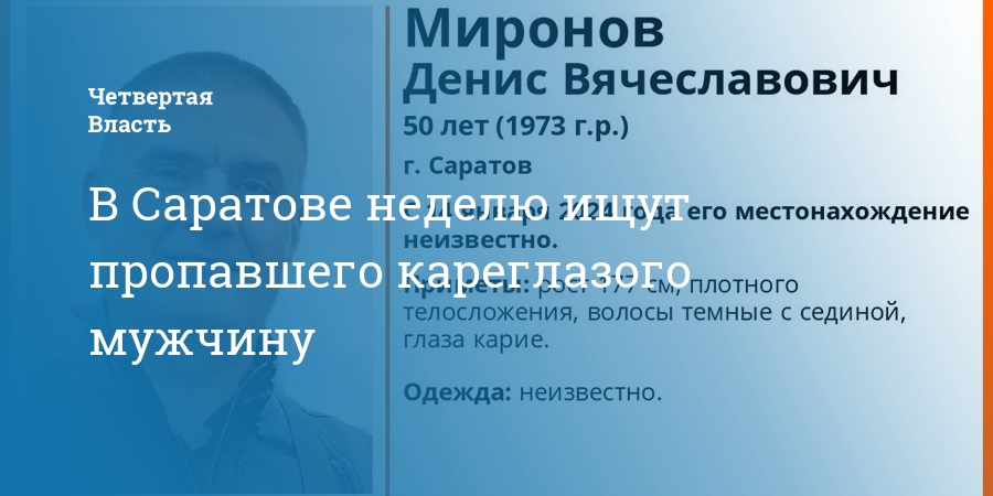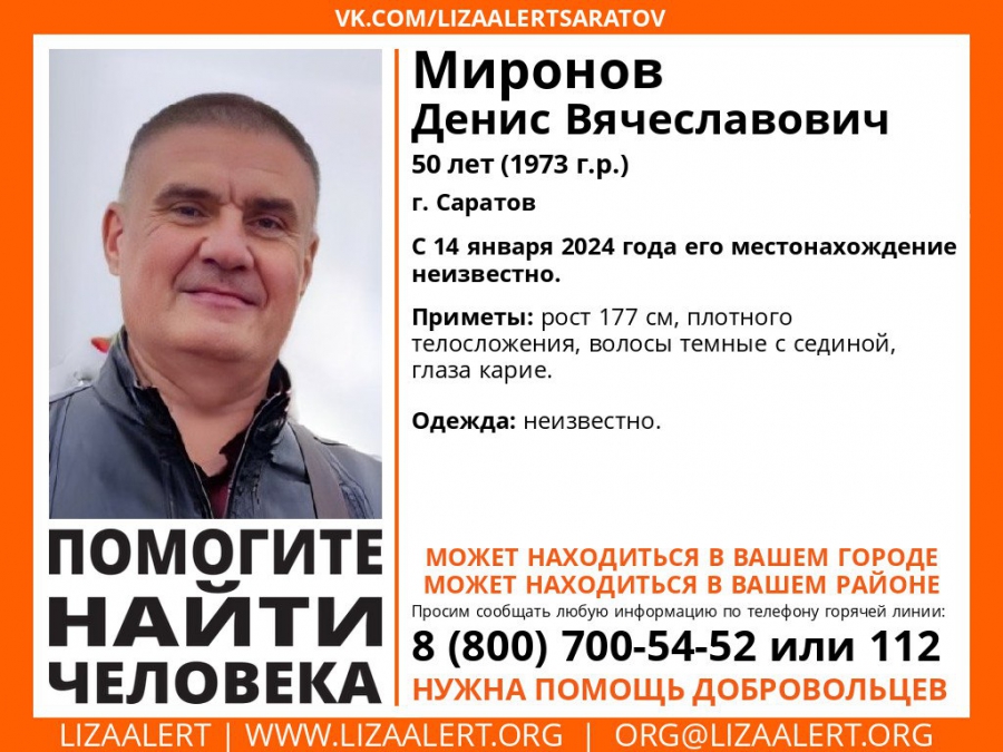 В Саратове ищут без вести пропавшего 50-летнего Дениса Миронова. Об этом сообщили в социальных сетях поискового отряда «ЛизаАлерт».
