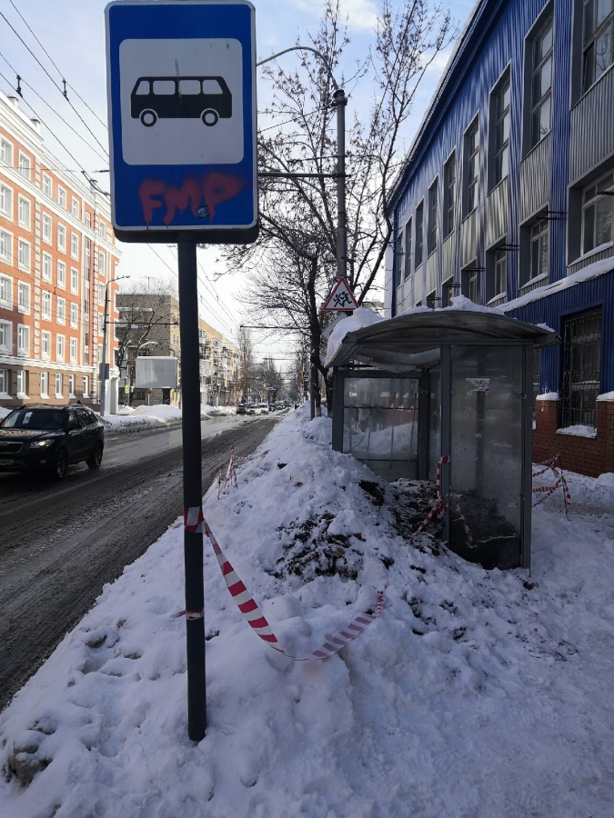 В центре Саратова остановка общественного транспорта стала местом для складирования снега и грязи. Судя по обнародованной очевидцем фотографии, туда завалили снега наполовину высоты остановки.