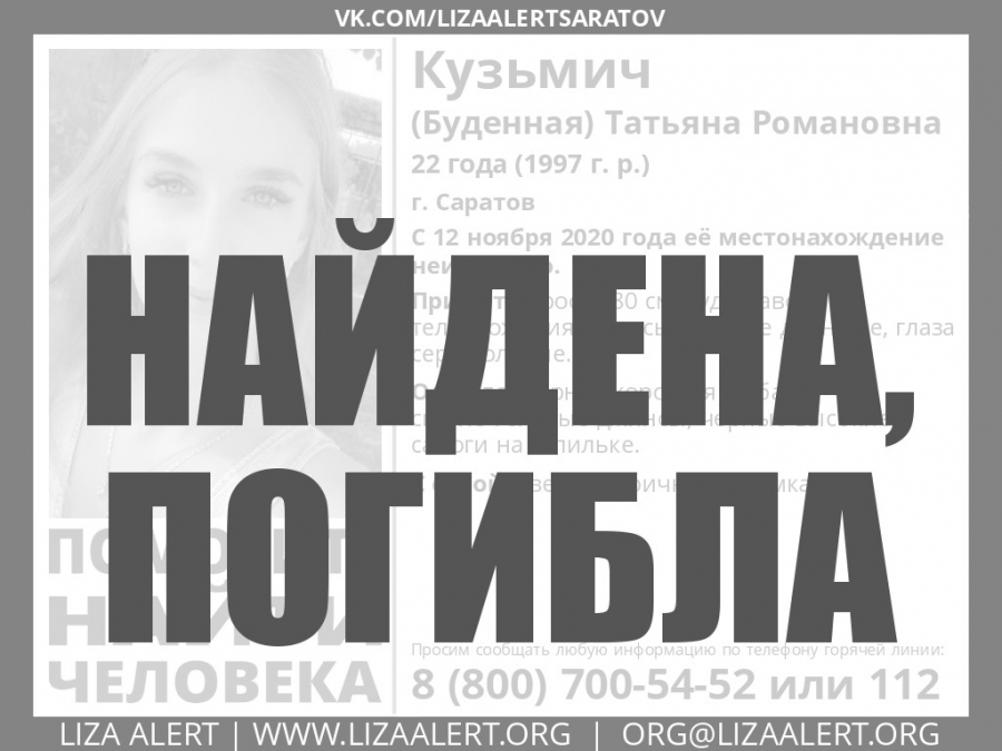Днем 13 ноября в поисково-спасательном отряде «Лиза Алерт» объявили о розыске Татьяны Кузьмич. Известно, что она приходилась дочерью директору одной из общеобразовательных школ. Вскоре тело погибшей нашли в подвале дома, где ее спрятал обвиняемый.