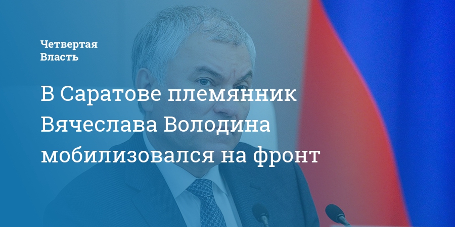 В Саратове племянник председателя Госдумы Вячеслава Володина принял решение мобилизоваться для участия в специальной военной операции на Украине. Об этом сообщила в своем телеграм-канале Анна Кашеварова, бывший пресс-секретарь Володина (это дает основание доверять указанной информации).