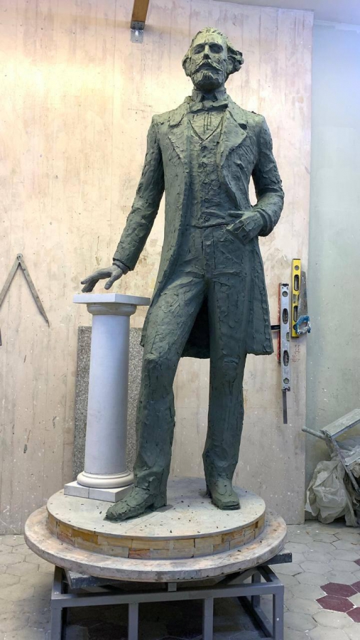Изготовление памятника уже началось, его автором выступит известный саратовский скульптор Андрей Щербаков. Художник поделился фотографиями со своей мастерской, где уже приступил к работе. В настоящее время он создает форму из мягкого материала в натуральную величину.