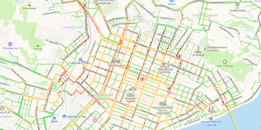 В настоящий момент наиболее затруднительная дорожная ситуация на ряде центральных улиц: Рахова, Астраханская, Чапаева, Большая Горная, Вольская. Стоят автомобилисты также в направлении ж/д вокзала (Вокзальная, Белоглинская, Аткарская).