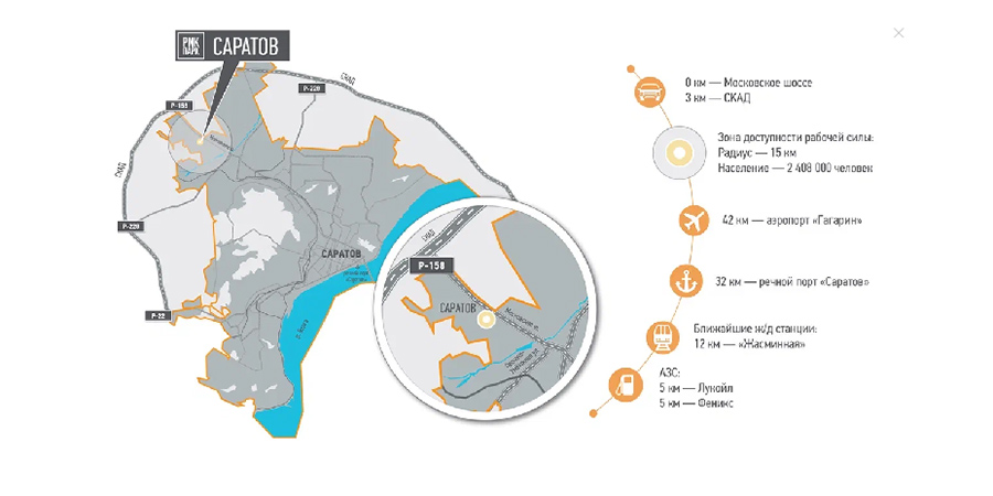 Согласно проекту, парк появится в 3 км от Саратовской кольцевой дороги, на Московском шоссе. Площадь земельного участка составит 106,6 га и будет размещать складские и промышленные объекты площадью более 510 тысяч кв. м. Всего собираются возвести 9 зданий площадью от 10 до 120 тысяч квадратных метров, которые в последствии купят или арендуют местные фирмы.