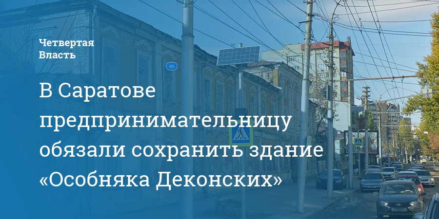 По данным суда, в январе этого года предпринимательницу Ирину Филимонову обязали провести работы по сохранению здания, расположенного на улице Советской, 65А (пересечение с Мирным переулком). Здание построено 1870-е годы и принадлежало известному саратовскому домовладельцу Деконскому, специализировавшемуся на предоставлении своей собственности под нужды военного ведомства. Согласно документу, привести в соответствующий вид нужно все части дома - А, Б и В. Решение вступило в законную силу и в течение 6 месяцев ИП обязана выполнить требования.