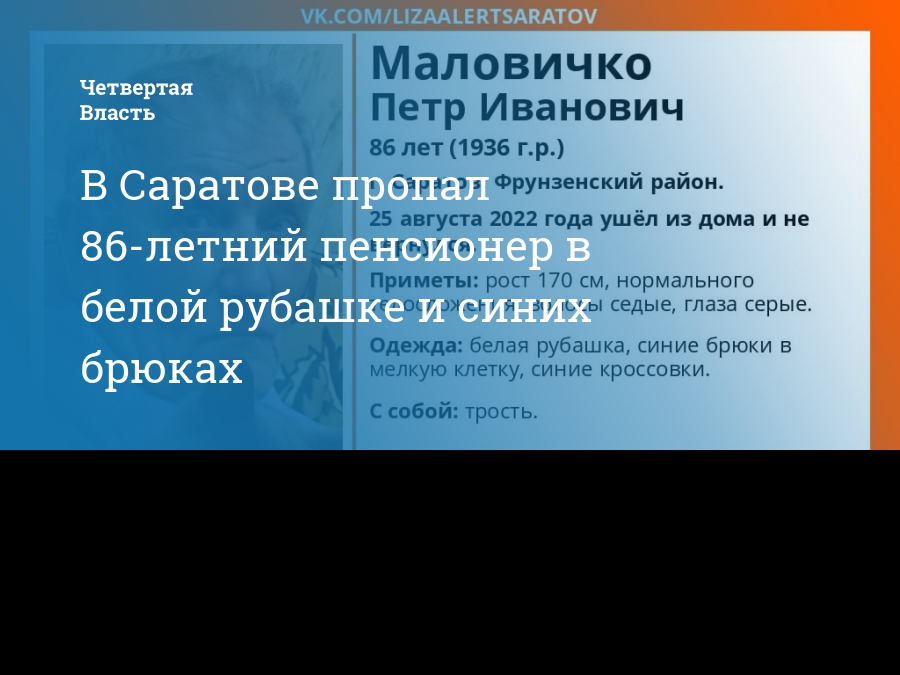 Вчера, 25 августа, во Фрунзенском районе Саратова пропал пенсионер 1936 г.р. Петр Маловичко. Об этом сообщает поисковый отряд «ЛизаАлерт».