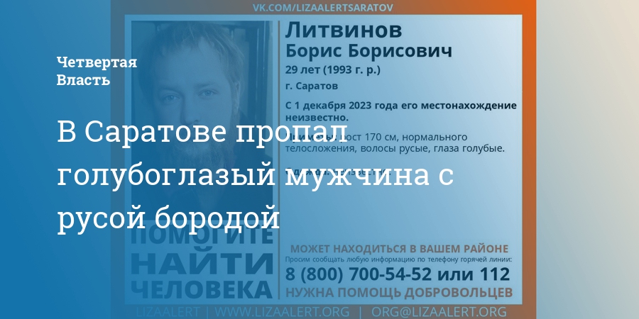 В Саратове разыскивают без вести пропавшего 29-летнего Бориса Литвинова. Об этом сообщили волонтеры поискового отряда «Лиза Алерт».