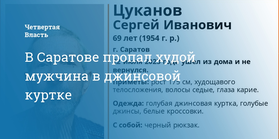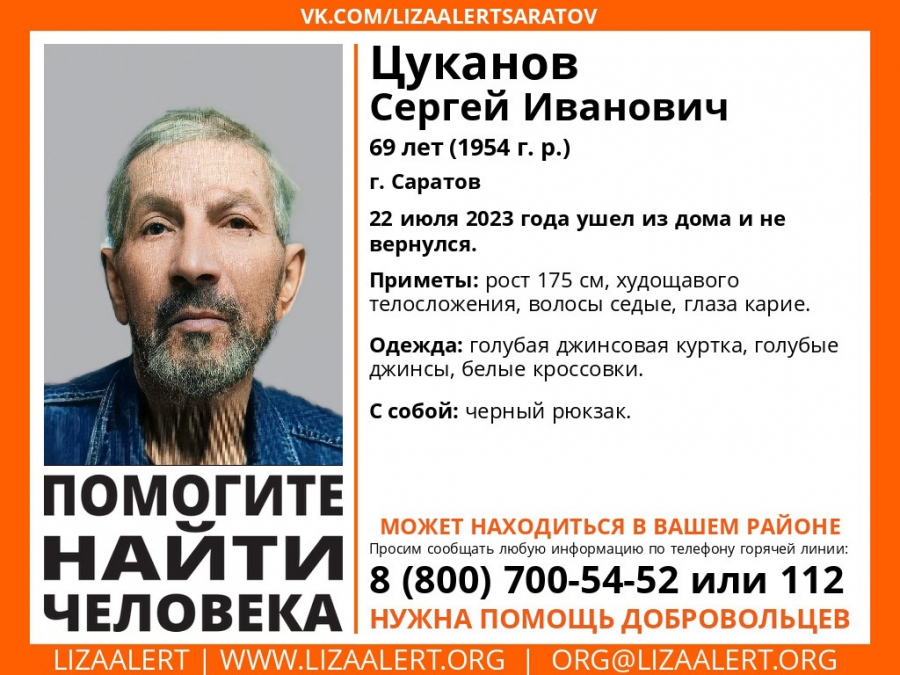 В последний раз его видели одетым в голубую джинсовую куртку, голубые джинсы и белые кроссовки. С собой мужчина брал черный рюкзак.