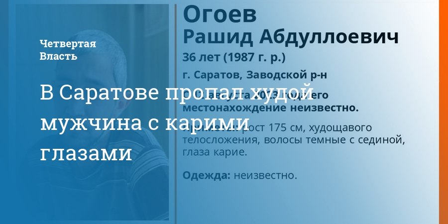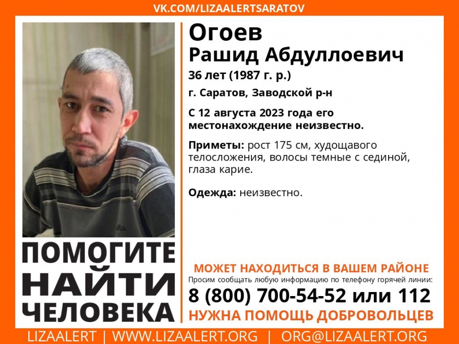 В Заводском районе Саратова без вести пропал 36-летний Рашид Огоев. Об этом сообщили в группе поискового отряда «ЛизаАлерт» соцсети «ВК».