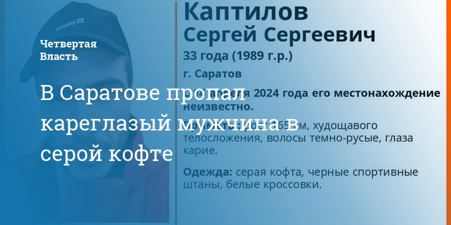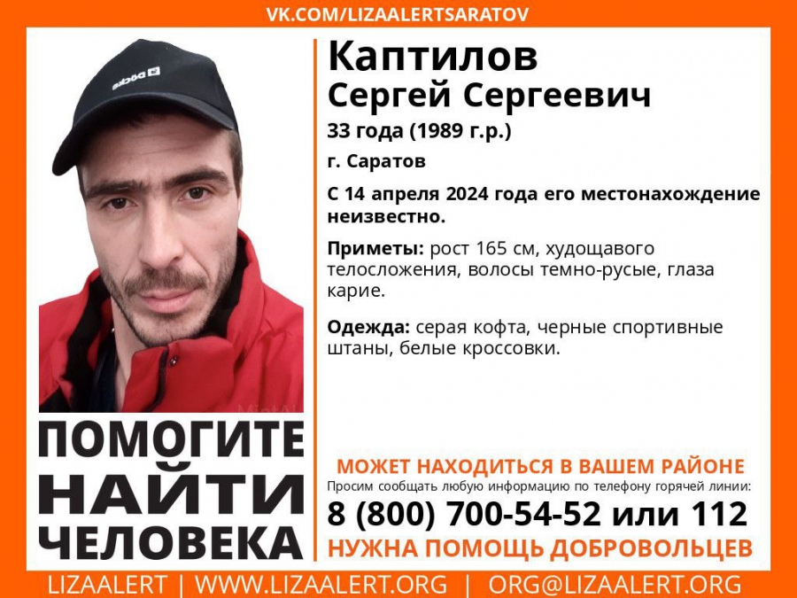 В Саратове без вести пропал 33-летний Сергей Каптилов. Об этом сообщили в телеграм-канале поискового отряда «ЛизаАлерт».