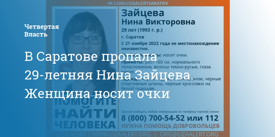 В Саратове волонтеры ищут без вести пропавшую 29-летнюю Нину Зайцеву. Об этом сообщили в региональном штабе поискового отряда «Лиза Алерт».