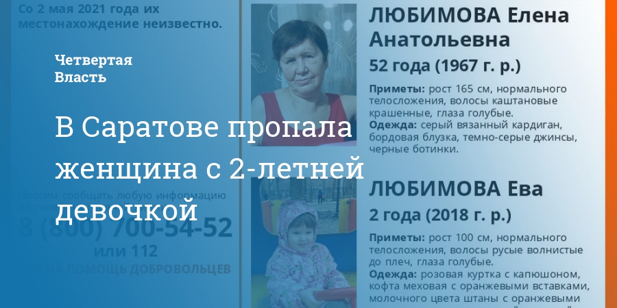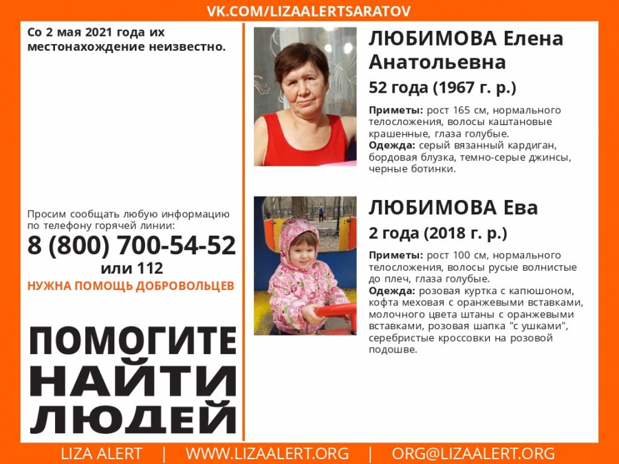 Елена Анатольевна Любимова и Ева Любимова пропали 2 мая. Елена Анатольевна ростом 165 см, нормального телосложения. У нее каштановые крашенные волосы и голубые глаза. Женщина была одета в серый вязаный кардиган, бордовую блузку, темно-серые джинсы, черные ботинки.
