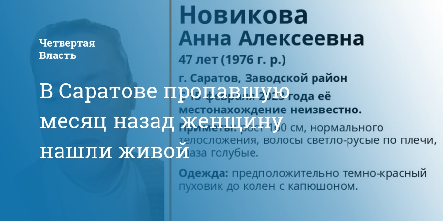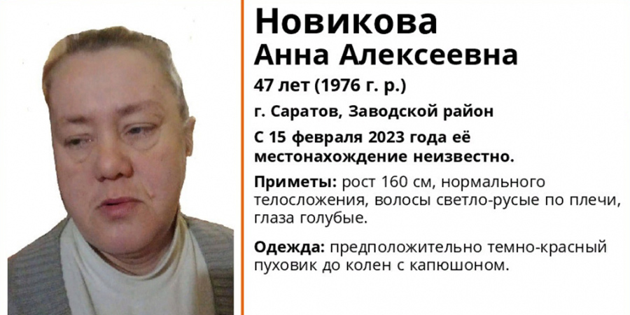 В Заводском районе Саратова живой обнаружили без вести пропавшую 47-летнюю Анну Новикову. Об этом сообщили в группе поискового отряда «ЛизаАлерт».