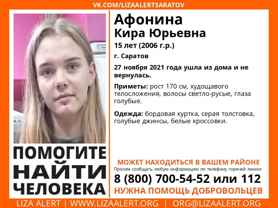На территории Саратова ведется розыск без вести пропавшей 15-летней Киры Афониной. Об этом информирует поисково-спасательный отряд «Лиза Алерт».