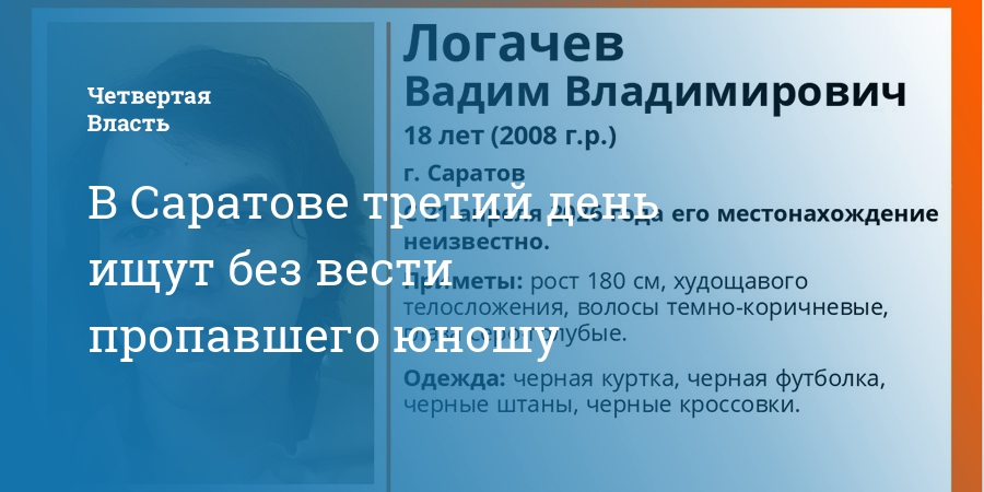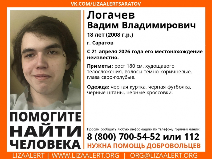 В Саратове ищут пропавшего на этой неделе 18-летнего Вадима Логачева. Об этом сообщает поисково-спасательный отряд «Лиза Алерт».