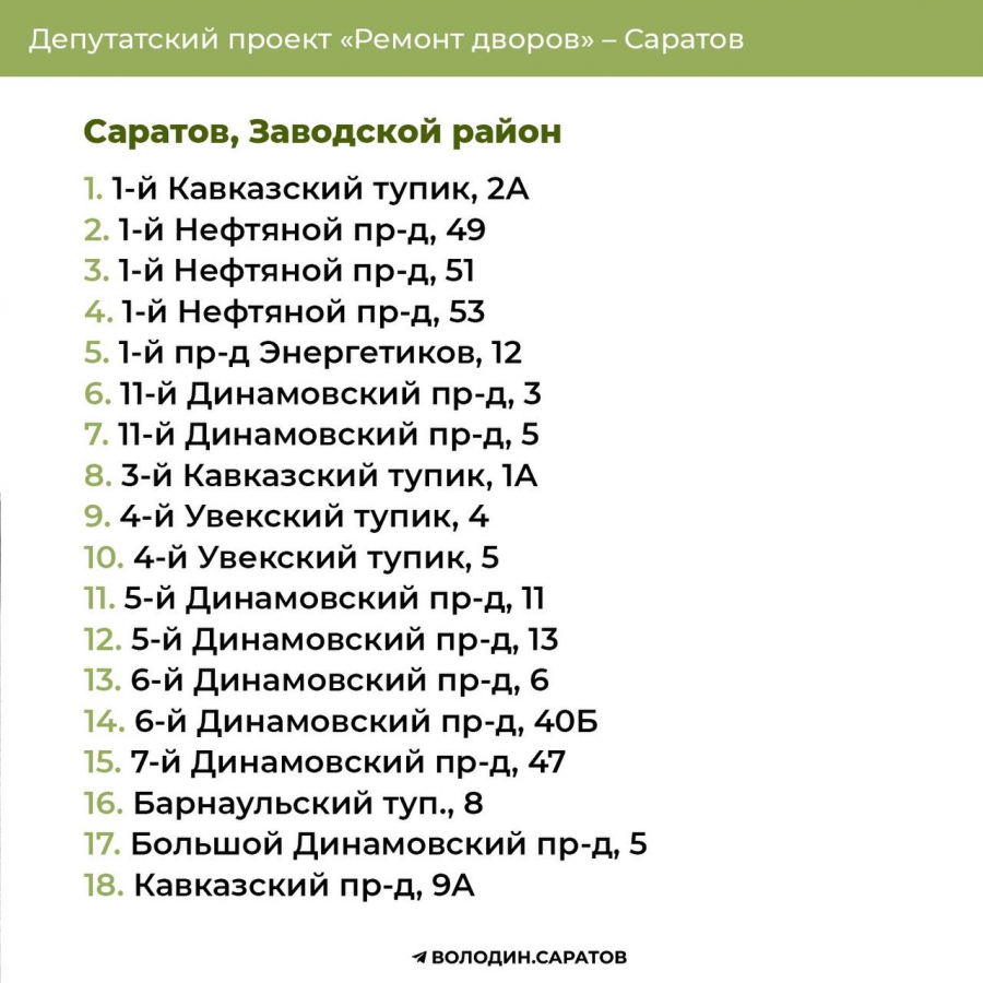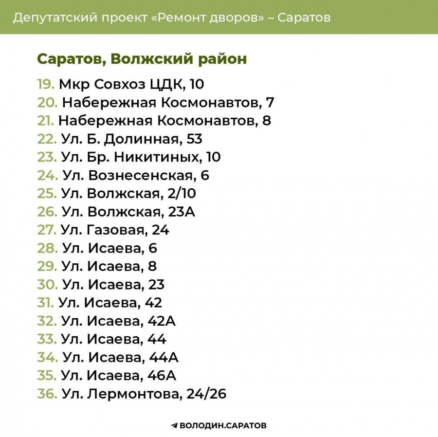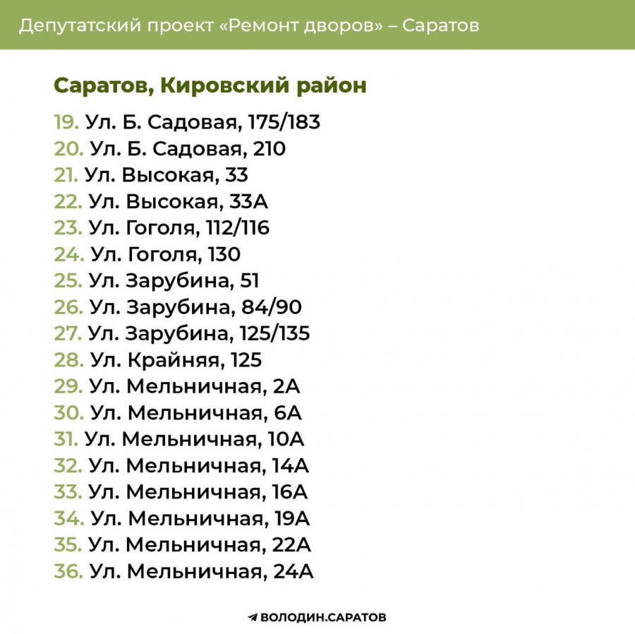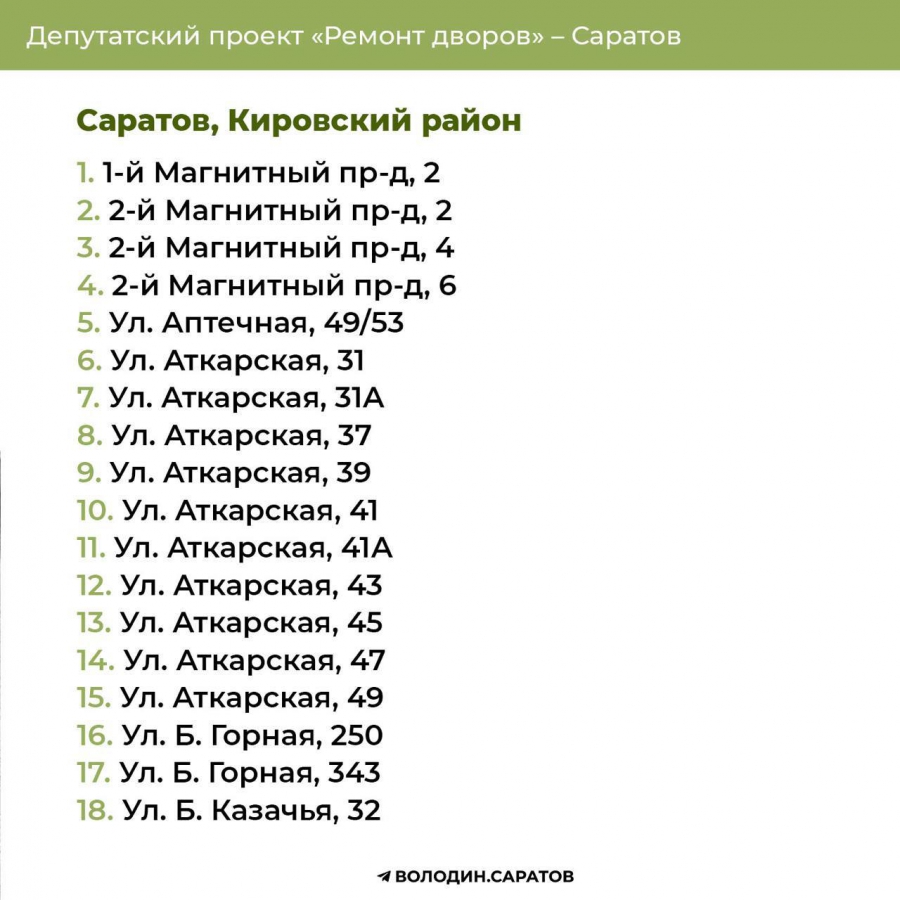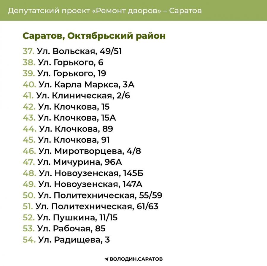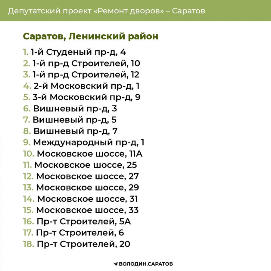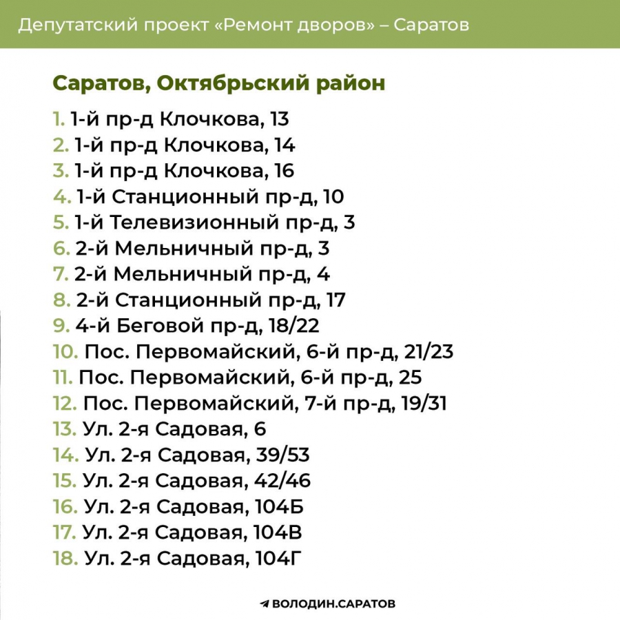 В Саратове стали известны все адреса дворов, которые в 2025 году будут отремонтированы по проекту председателя Госдумы Вячеслава Володина. Соответствующие списки опубликовали в своем телеграм-канале сторонники спикера.