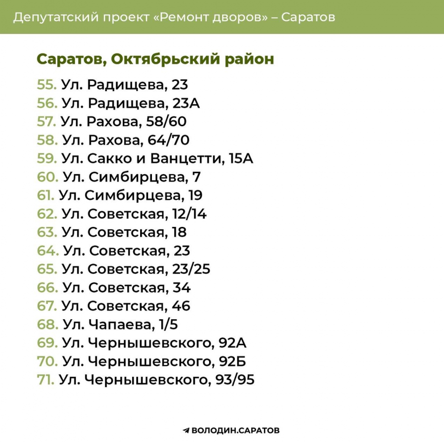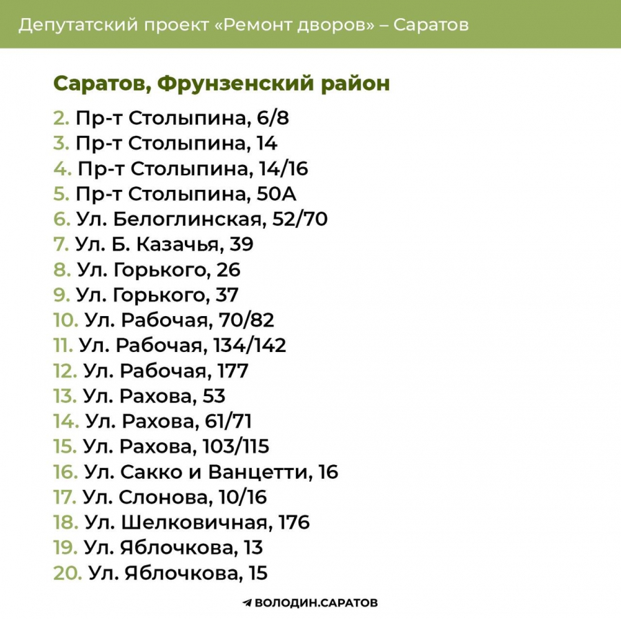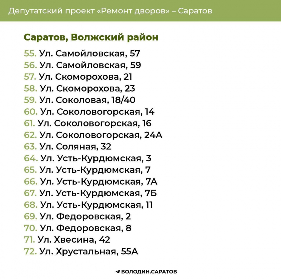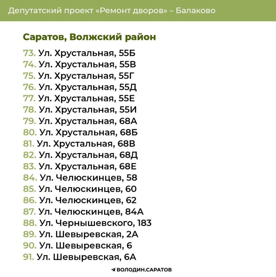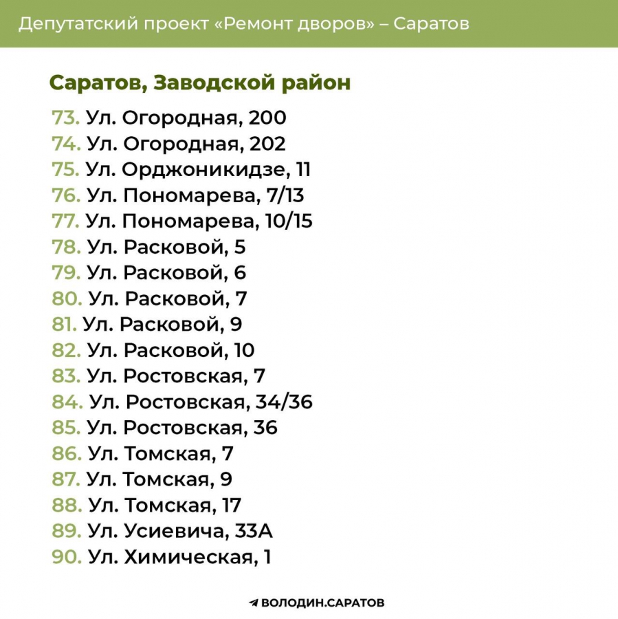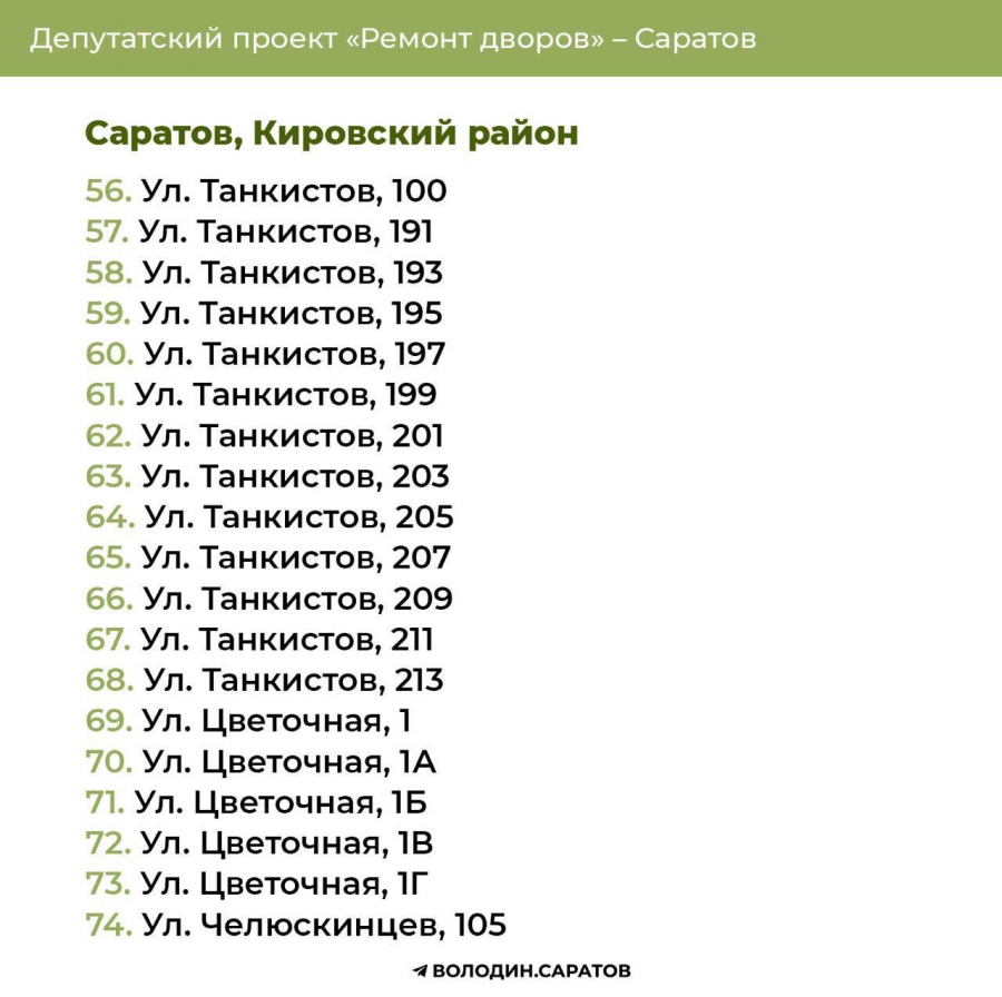 В Саратове стали известны все адреса дворов, которые в 2025 году будут отремонтированы по проекту председателя Госдумы Вячеслава Володина. Соответствующие списки опубликовали в своем телеграм-канале сторонники спикера.