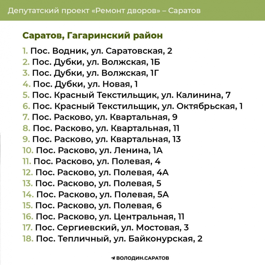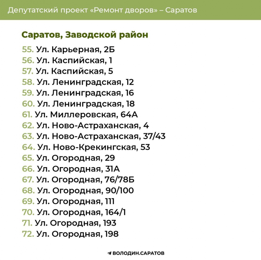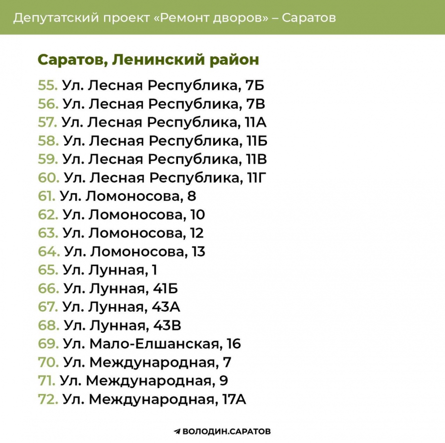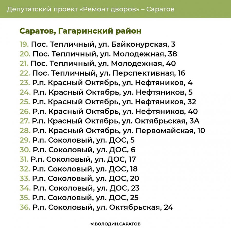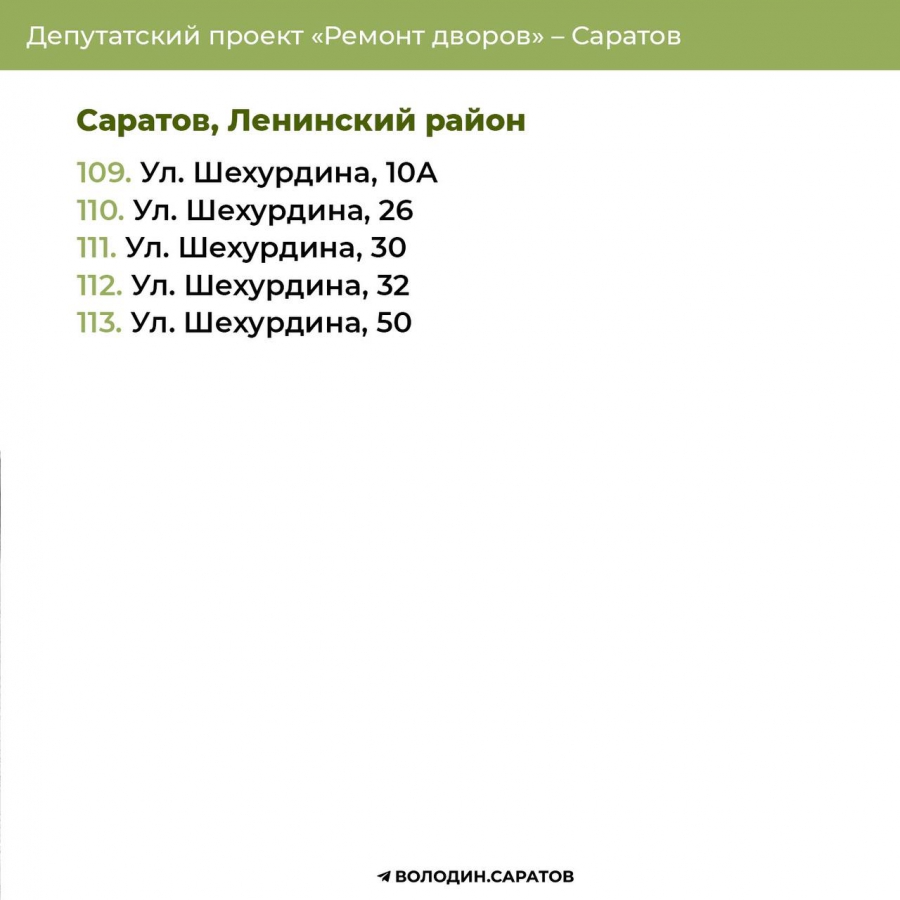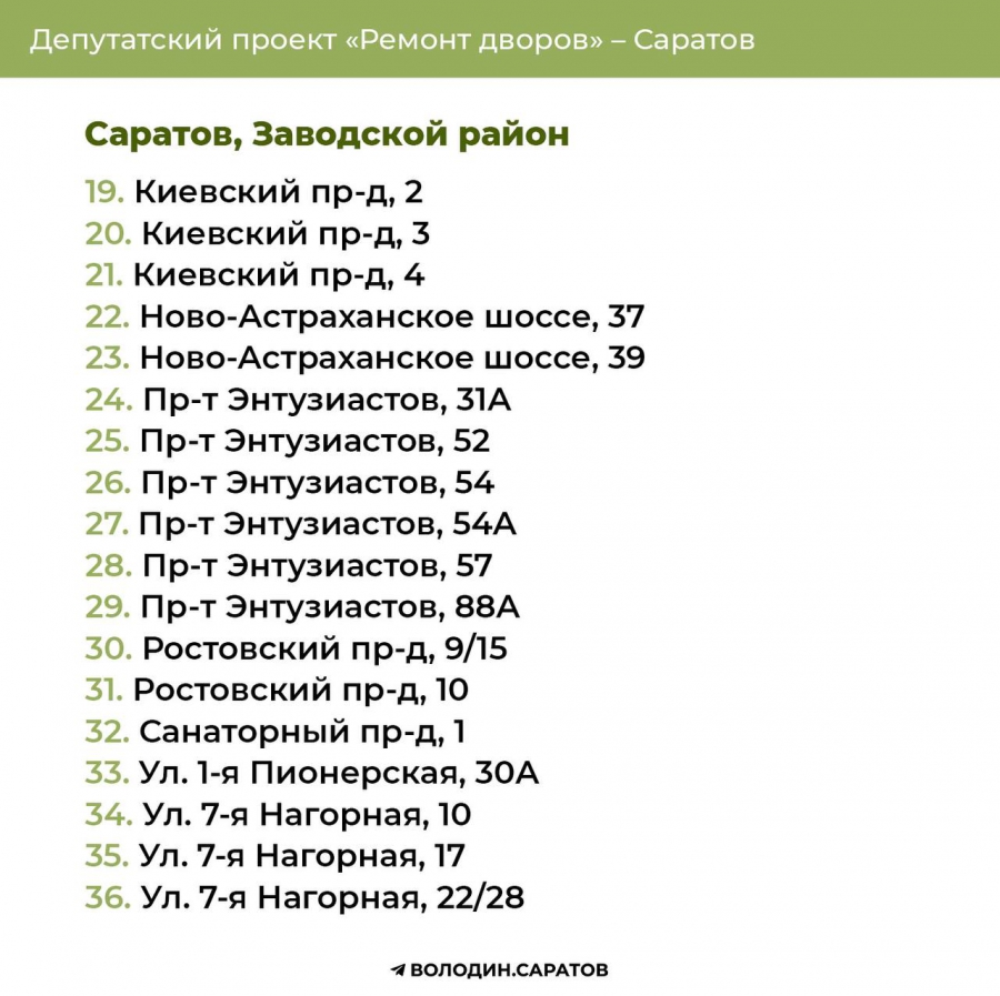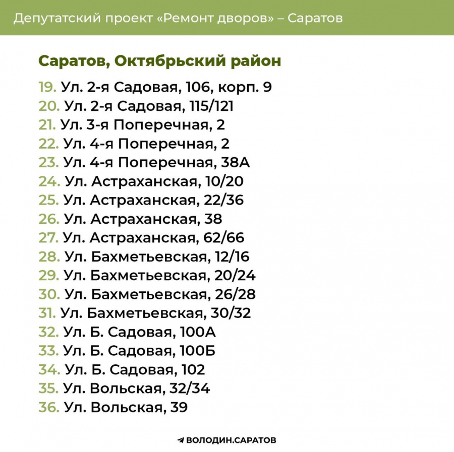 В Саратове стали известны все адреса дворов, которые в 2025 году будут отремонтированы по проекту председателя Госдумы Вячеслава Володина. Соответствующие списки опубликовали в своем телеграм-канале сторонники спикера.