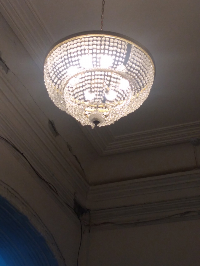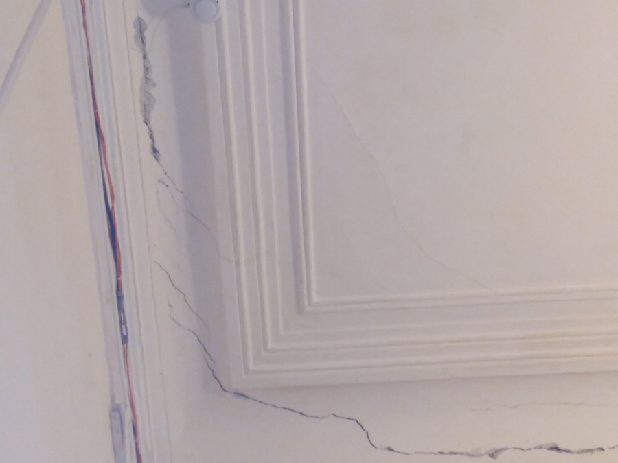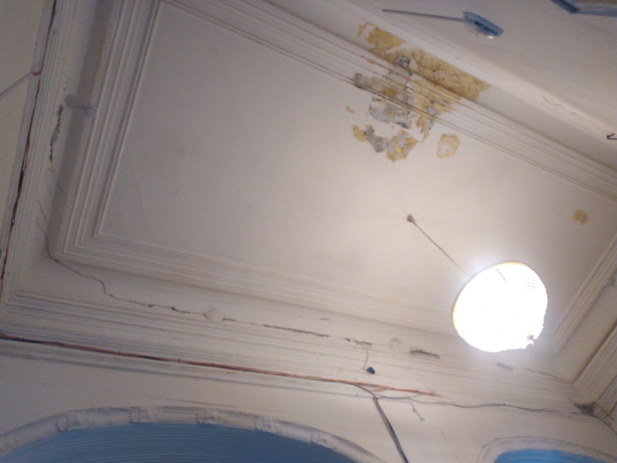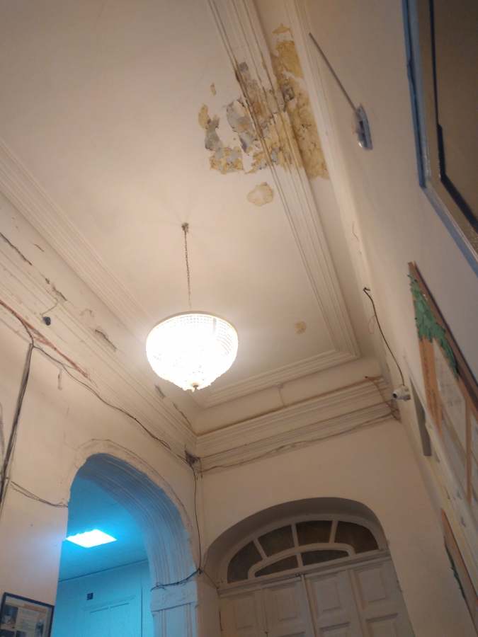 Женщина пояснила, что в музыкальной школе №19, которая расположена в Доме работников искусств, с потолка осыпается побелка. На фоне хрустальной люстры на потолке и в верхней части стен расползлись трещины, видно проводку. А на белом потолке образовались большие проплешины, в которых видно желто-серый материал.