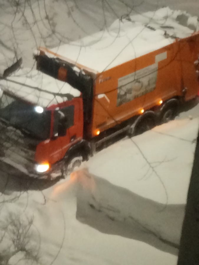 Аналогичное происшествие – но со спецтехникой другого назначения – случилось на улице Артиллерийское у дома №10. По наблюдениям горожанина Ярослава Эленгаупта, мусоровоз застрял в снегу и стоял с 18.00 как минимум до 0.30.