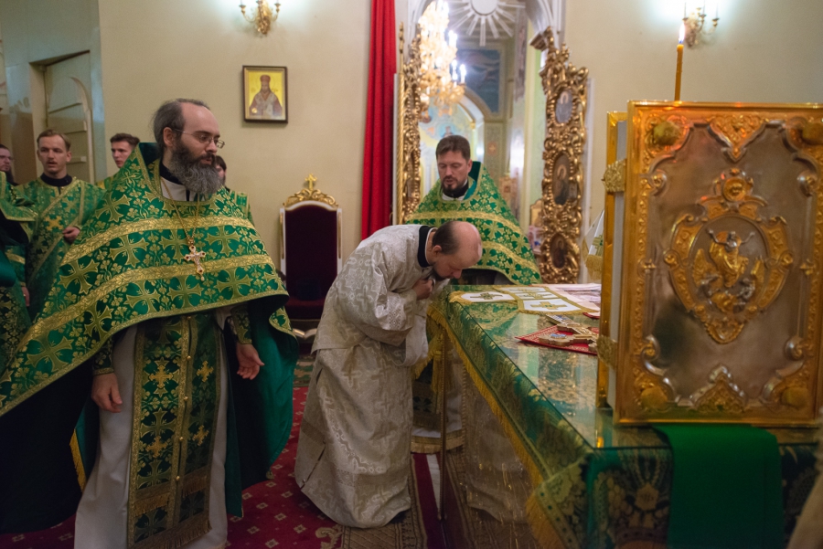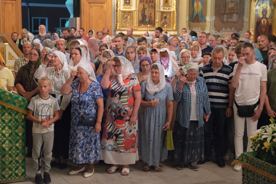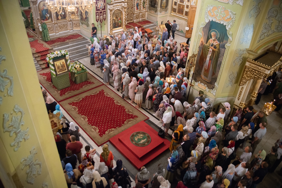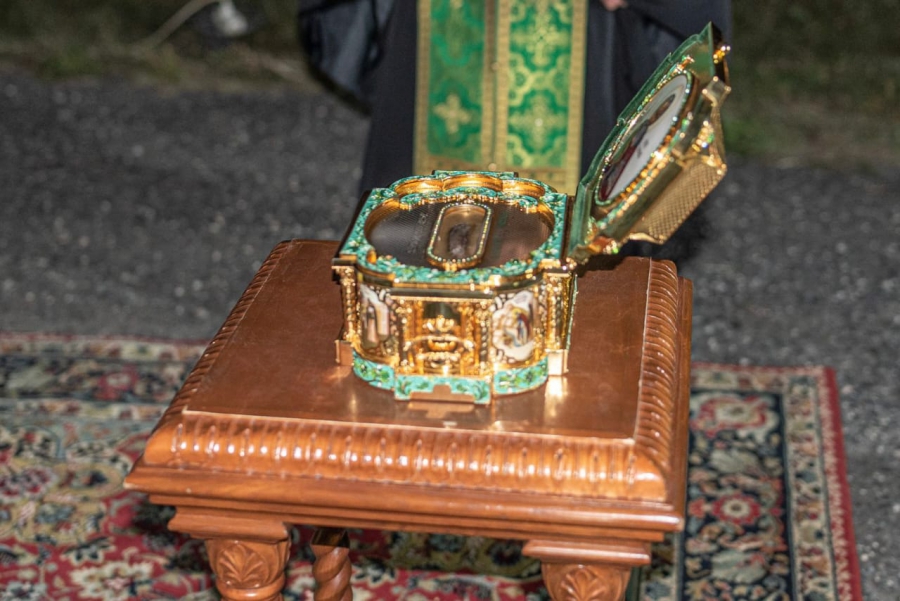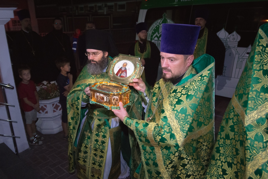 Ковчег с мощами разместили на украшенном столе в центре собора, рядом, на аналое, поставили икону преподобного. Непрерывно будут совершаться водосвятные молебны с акафистом.