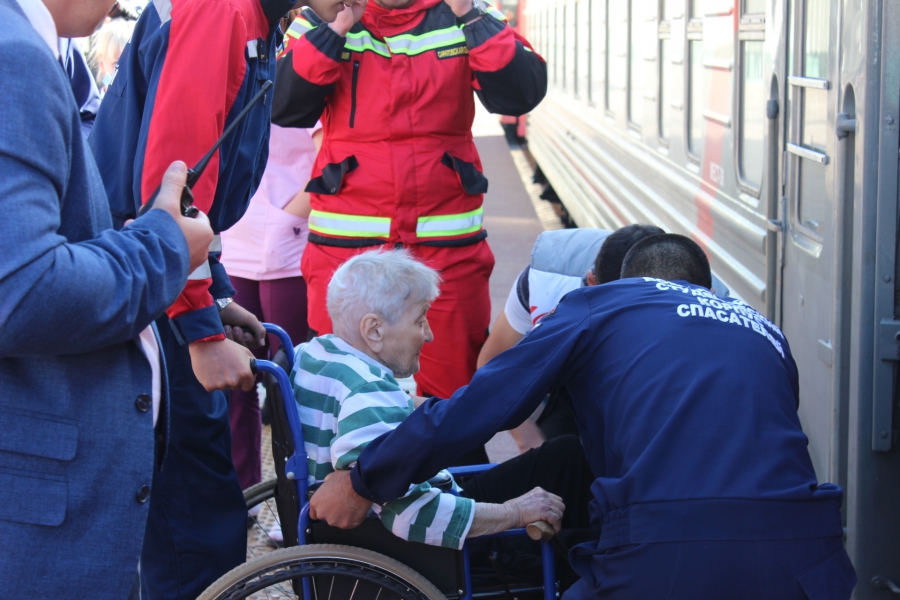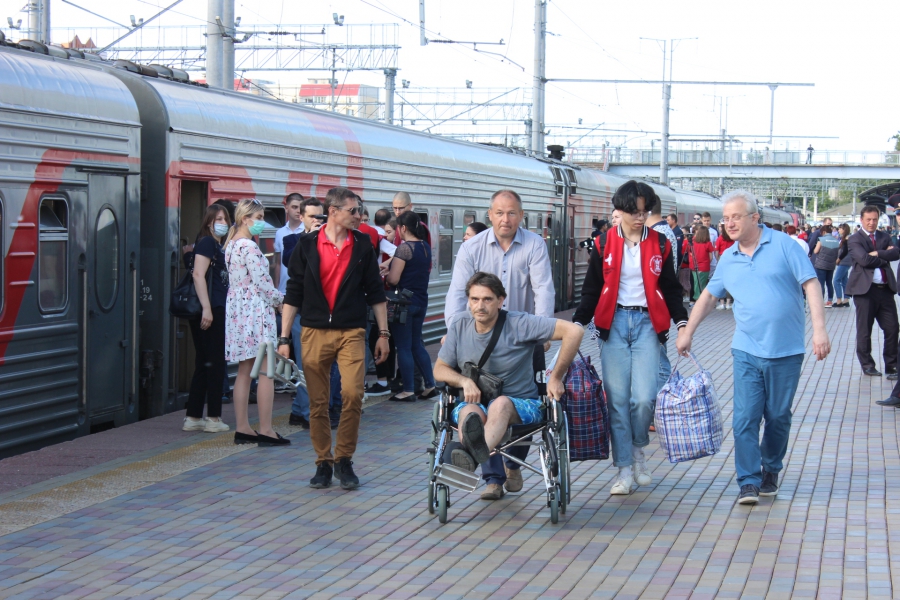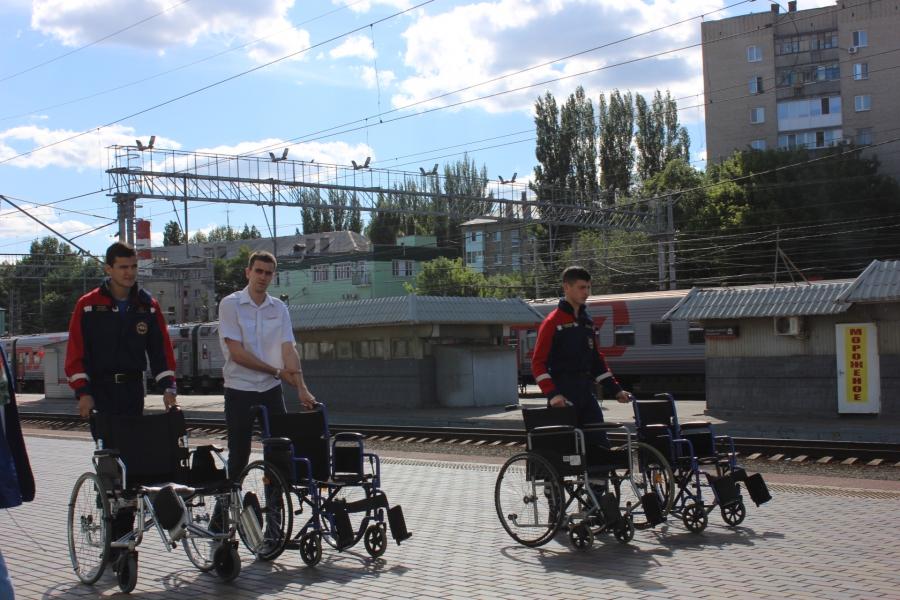 По словам корреспондента 4В, на подходах к вокзалу и внутри усиленно дежурила полиция. Поезд прибыл на первый путь. Вагоны и людей в них осмотрели правоохранители и медики. Первыми на саратовскую землю вышли маломобильные граждане, для них заранее приготовили инвалидные коляски.