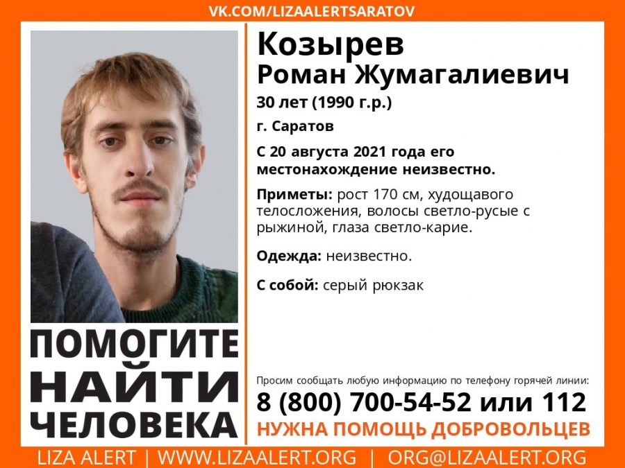 Пропавший ростом 170 см, имеет худощавое телосложение, светло-русые волосы с рыжиной и светло-карие глаза. В момент исчезновения у Романа Козырева с собой был серый рюкзак.