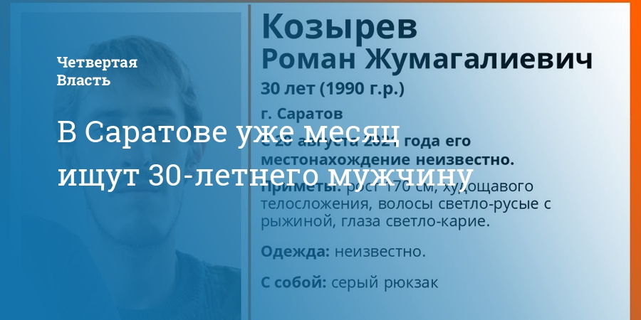 В Саратове с 20 августа ищут Романа Козырева 1990 года рождения. Об этом сообщает поисковое сообщество «ЛизаАлерт».