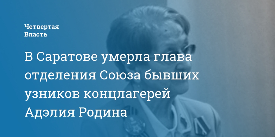 Вчера, 29 апреля, скончалась председатель Саратовского регионального отделения Российского Союза бывших малолетних узников фашистских концлагерей Адэлия Родина. О смерти общественницы сообщили в пресс-службе министерства труда и социальной защиты.