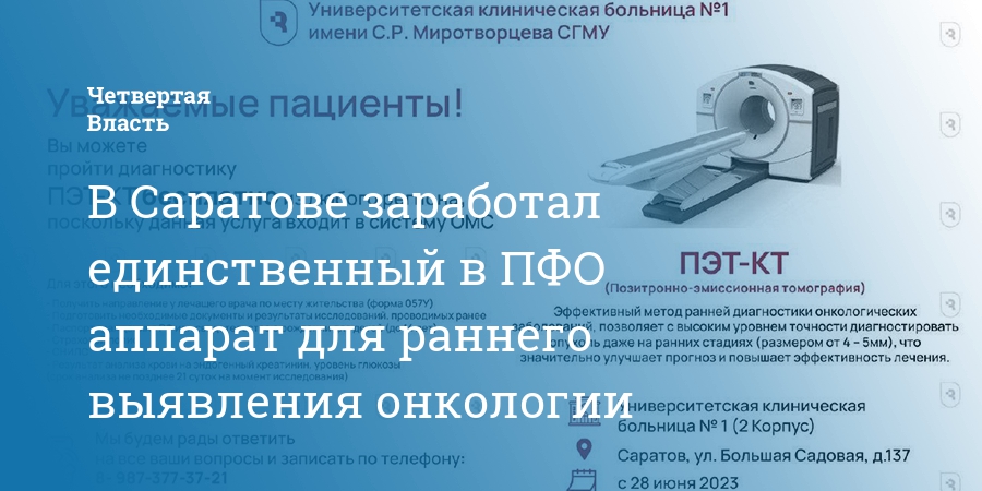 В Саратове в исследовательском центре кластерной онкологии (Большая Садовая, 137) заработал единственный в ПФО аппарат позитронно-эмиссионной компьютерной томографии (ПЭТ КТ) для раннего выявления заболеваний. Об этом сообщил сегодня, 28 июня, сторонники председателя Госдумы Вячеслава Володина в телеграм-канале «Володин Саратов».
