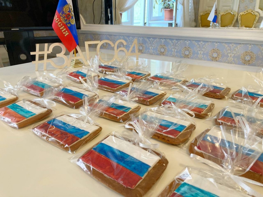 В саратовском «Дворце бракосочетаний» всем брачующимся предложили поучаствовать в квизе и ответить на вопросы по истории российского флага. Всех участников ждал приз в виде сладкого подарка – пряника в форме триколора.