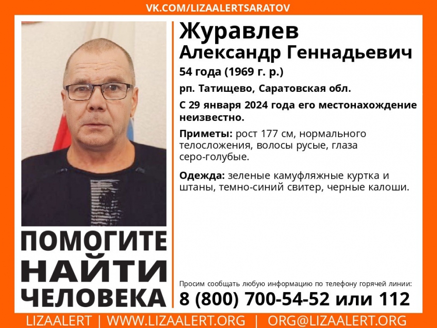 Кроме того, в Татищеве уже с 29 января ищут 54-летнего Александра Журавлева. Рост мужчины составляет 177 см, он имеет нормальное телосложение, русые волосы и серо-голубые глаза. Александр Геннадьевич был одет в зеленые камуфляжные куртку и штаны, темно-синий свитер и черные калоши.
