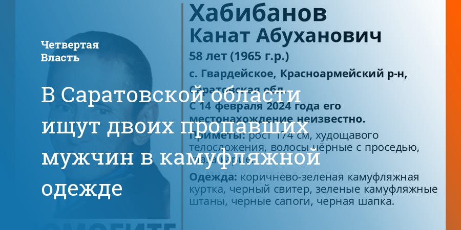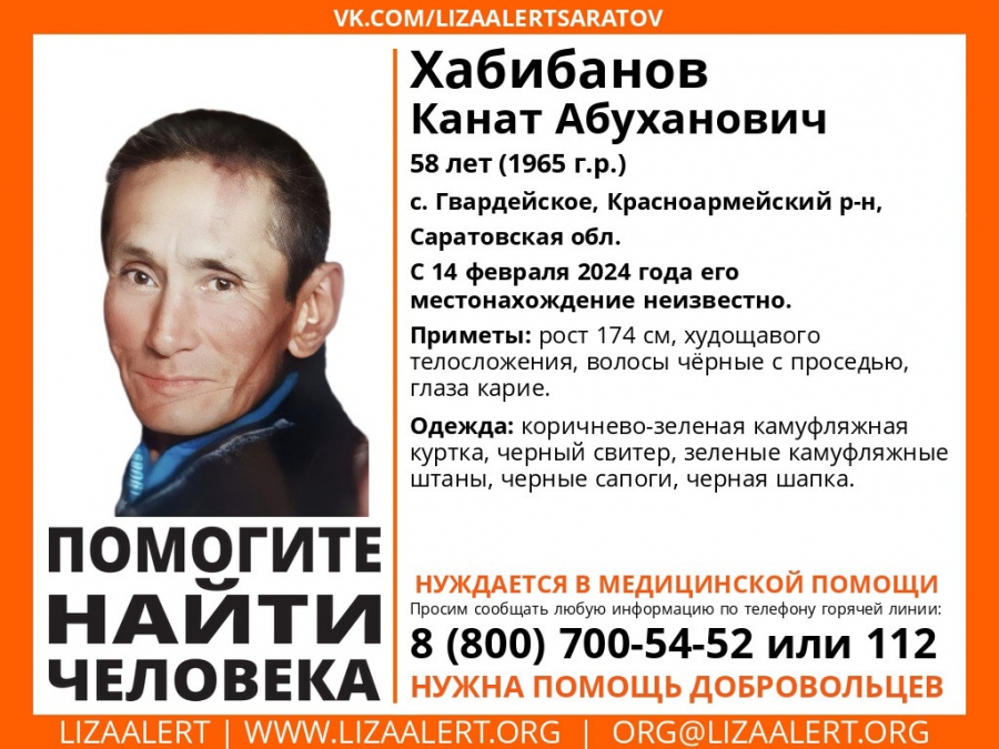 В Красноармейском районе Саратовской области без вести пропал 58-летний Канат Хабибанов. Об этом сообщили в соцсетях поискового отряда «ЛизаАлерт».