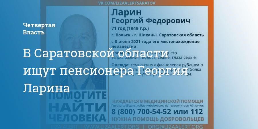 Волонтеры ищут в Саратовской области 71-летнего пенсионера Георгия Ларина. Соответствующую информацию опубликовал поисковый отряд «ЛизаАлерт».