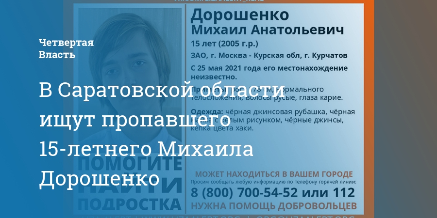 В Саратовской области может находиться пропавший между Москвой и Курской областью 15-летний Михаил Дорошенко. Об этом сообщили поисковики отряда «Лиза Алерт».