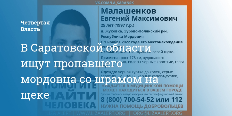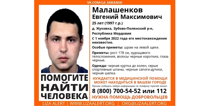 По данным отряда, 1 ноября Евгений Малашенков без вести пропал из Зубово-Полянского района республики Мордовии. У мужчины черные глаза и волосы. Его рост – 178 см, телосложение описали как худощавое. Последний раз он был одет в черную куртку до колен, черные ботинки и шапку и серые спортивные штаны. Из особых примет выделили шрам на левой щеке.