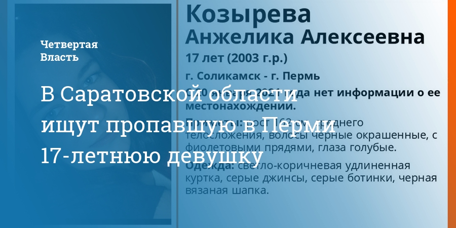 На территории Саратовской области может находиться без вести пропавшая 17-летняя Анжелика Козырева, которую уже 1,5 месяца ищут в Пермском крае. Такую информацию сегодня, 3 марта, опубликовало саратовское подразделение поисково-спасательного отряда «Лиза Алерт».