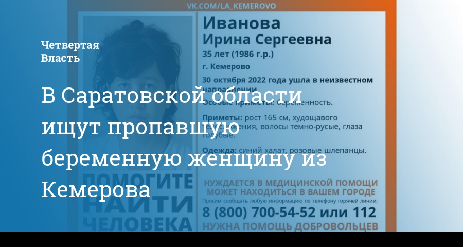 В Саратовской области может находиться 35-летняя беременная Ирина Иванова, которая без вести пропала в Кемерове. Об этом сегодня, 2 ноября, сообщили в группе поискового отряда «Лиза Алерт» соцсети «ВК».