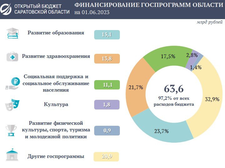 По словам чиновников, на финансирование 20 государственных программ области направлено 63,6 млрд рублей, или 97,2% от совокупных расходов регионального бюджета на 1 июня 2023 года.