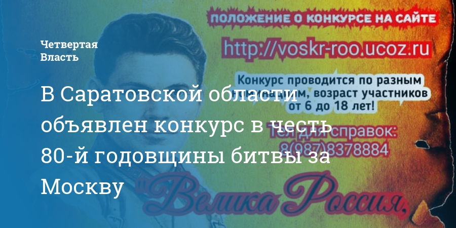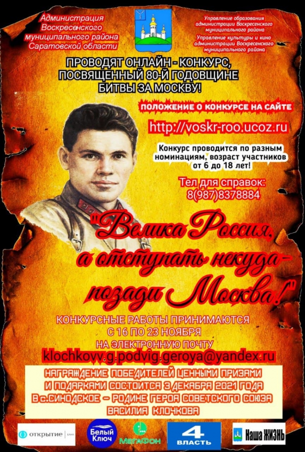 В Саратовской области начался онлайн-конкурс, посвященный 80-й годовщине битвы за Москву. Он называется «Велика Россия, а отступать некуда-позади Москва!». Его организовала администрация Воскресенского района. Основные задачи мероприятия – воспитание патриотизма, стремление показать влияние событий Московской битвы на весь дальнейший ход Великой Отечественной войны, формирование уважения к героической истории и воинской славы России, а также расширение исторических знаний.