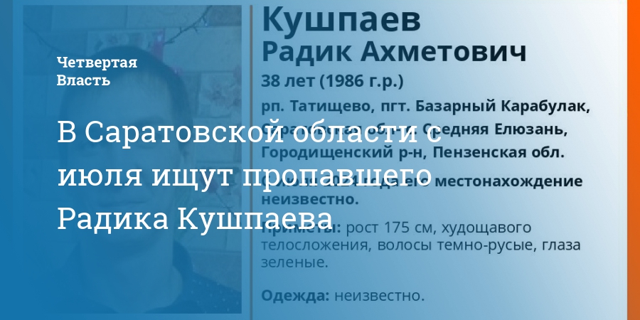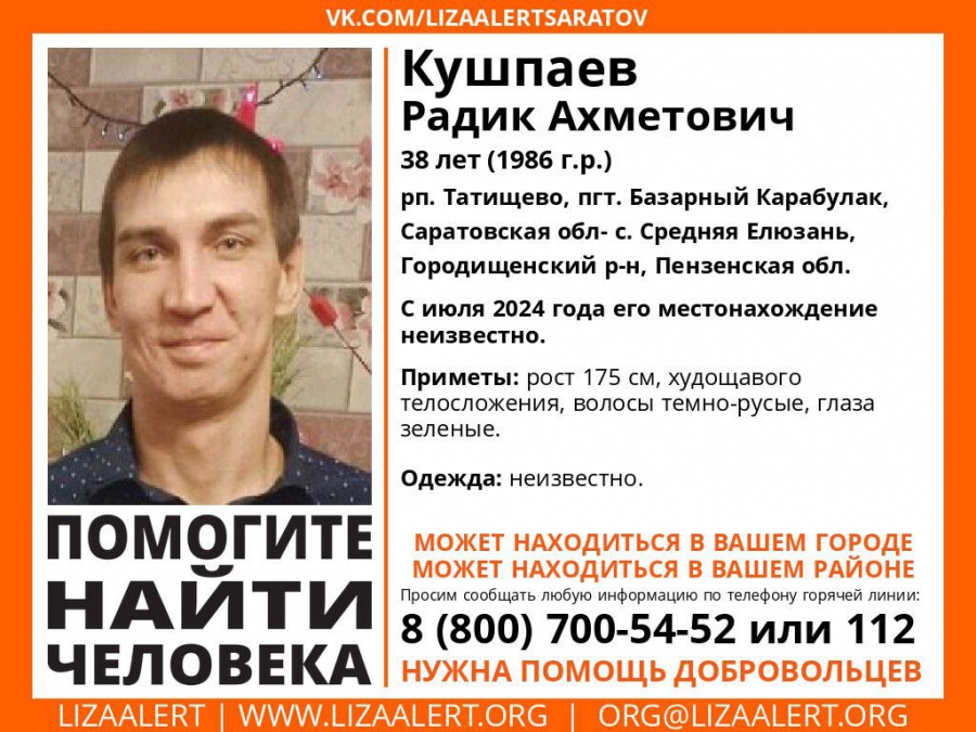 По сведениям поисковиков, Радик Ахметович 1986 г.р. может находиться в Татищеве, Базарном Карабулаке или в селе Средняя Елюзань (Пензенская область).