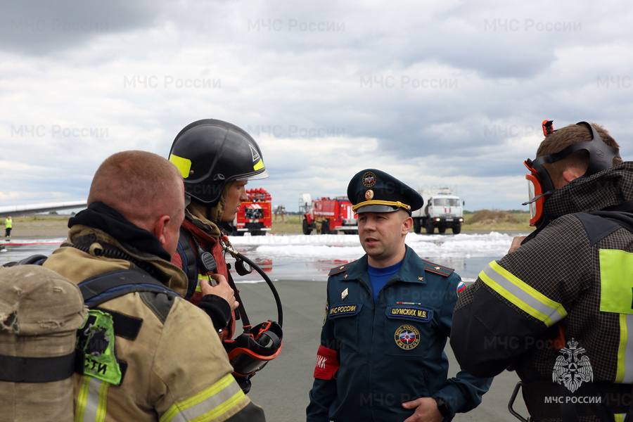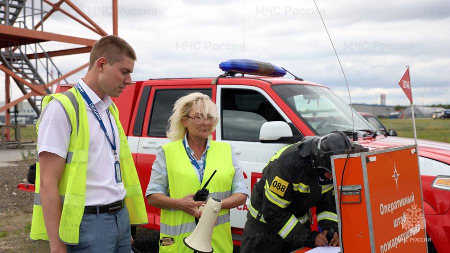 Сначала к месту прибыли аварийно-спасательные команды аэропорта. Они первыми бросились тушить пожар и спасать людей. Затем подъехала аэромобильная группировка МЧС. На свежий воздух выводили статистов, вытаскивали манекены. Всего на учениях с участием более 70 человек задействовали 15 единиц техники.