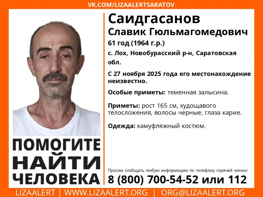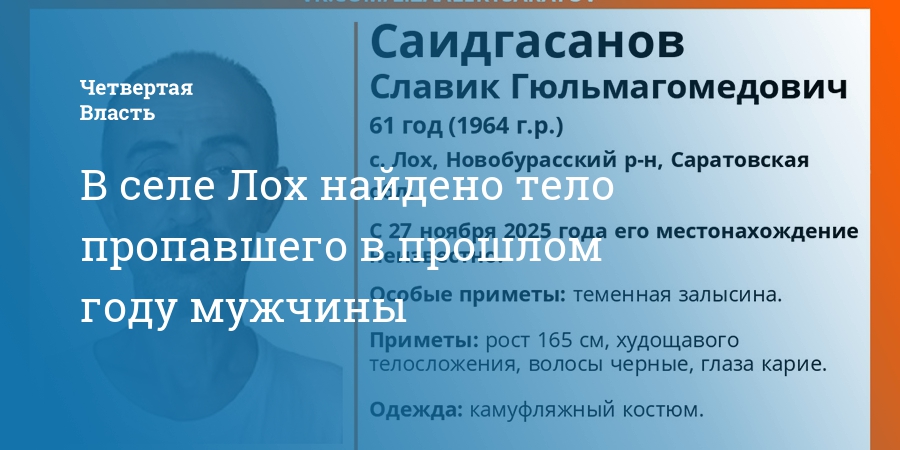По предварительным данным, 3 апреля на берегу пруда в селе Лох обнаружено тело Славика Саидгасанова. Его местоположение не могли установить с 27 ноября 2025 года, такую информацию публиковал поисково-спасательный отряд «Лиза Алерт».