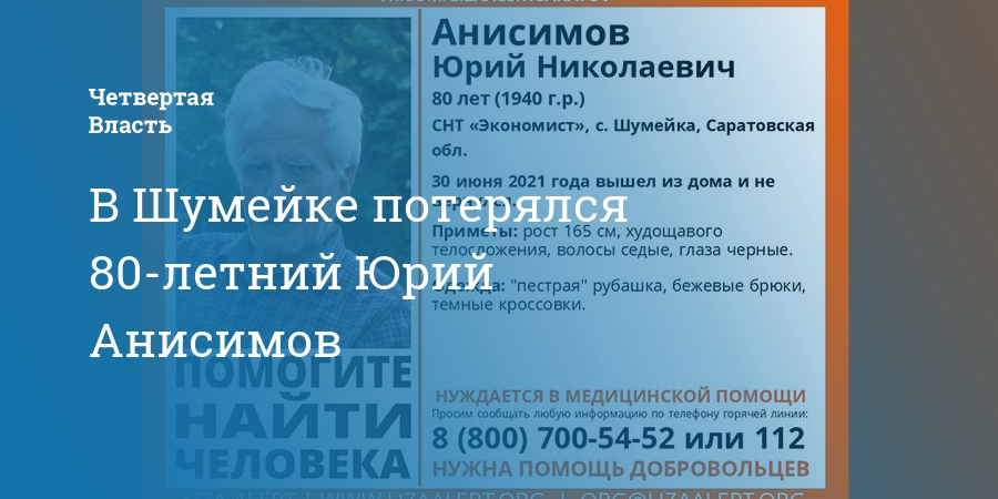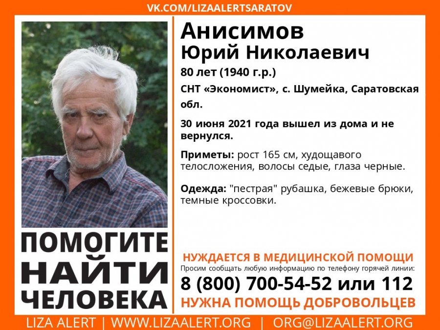 Сегодня, 30 июня, в селе Шумейка Саратовской области потерялся 80-летний Юрий Анисимов. Об этом сообщили поисковики отряда «Лиза Алерт».